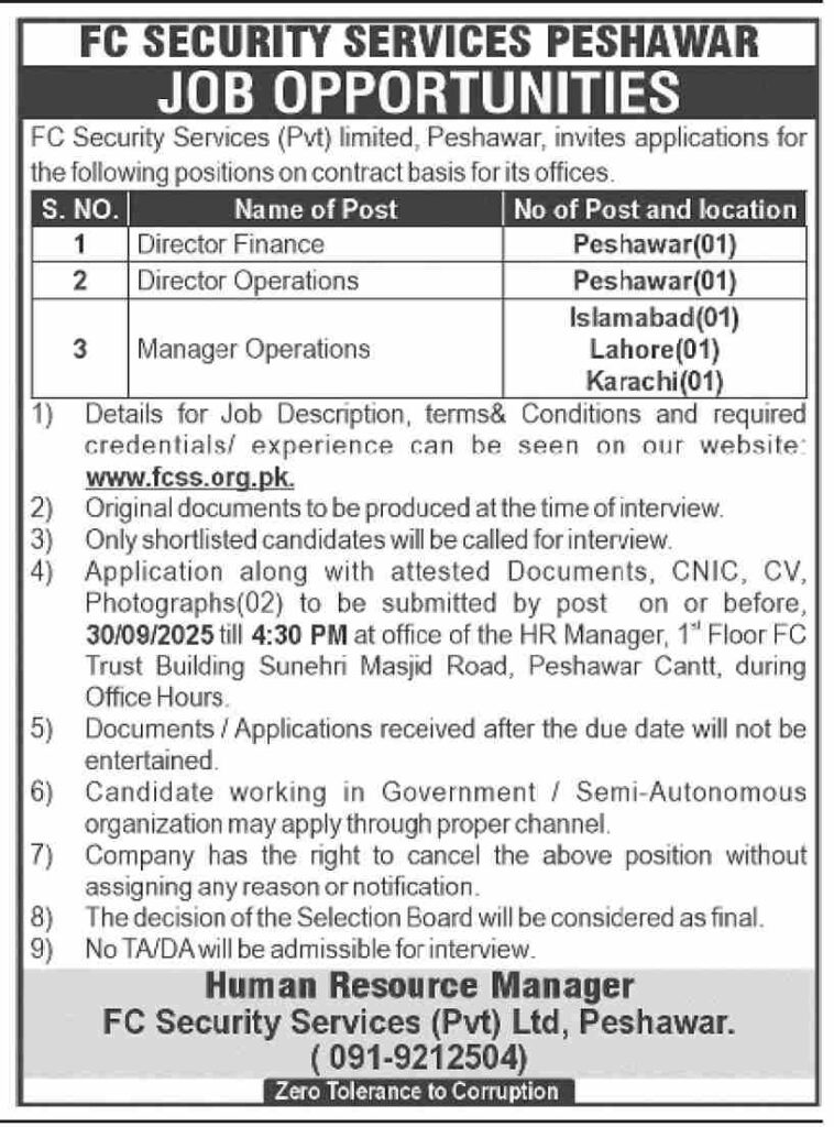 jobs FC Security Services Peshawar Finance Director Operations Director Manager Operations Lahore Karachi Islamabad private jobs Pakistan